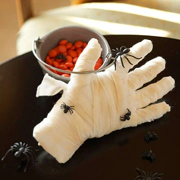 Nothing says "yuck!" like an ancient, dismembered mummy hand lying on the coffee table. Just fill up a disposable glove with cotton balls, all the way up to the fingertips. Then, wrap approx. 5 yards of gauze completely around the glove and tie a knot at the bottom to secure. You can even apply some brown chalk to give the hand a dirty, aged look. Throw in some plastic spiders and, voila!