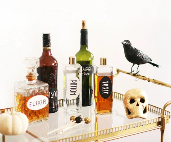This one's super easy and perfect for any adult Halloween gathering. Grab some bottles from the pantry or take a trip to the nearest thrift store and grab the oldest glass decanters you can find. Then, create your own spooky labels with words like "elixir", "posion", "witches brew" or whatever you think will creep out your guests the most!