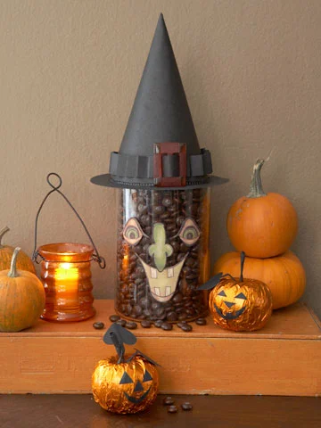 This easy-to-make candy container will scare the socks off all your guests! All you need is some dark-colored candy, a clear container and some black cardstock for the hat. See project details here.
