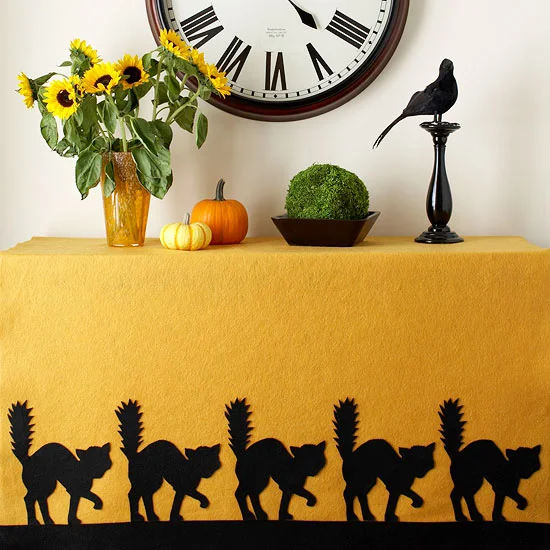 Felt is your friend! Cut some spooky cats out of black felt and glue them to the bottom of a tablecloth or large piece of orange felt. You can get this particular cat pattern from BHG.